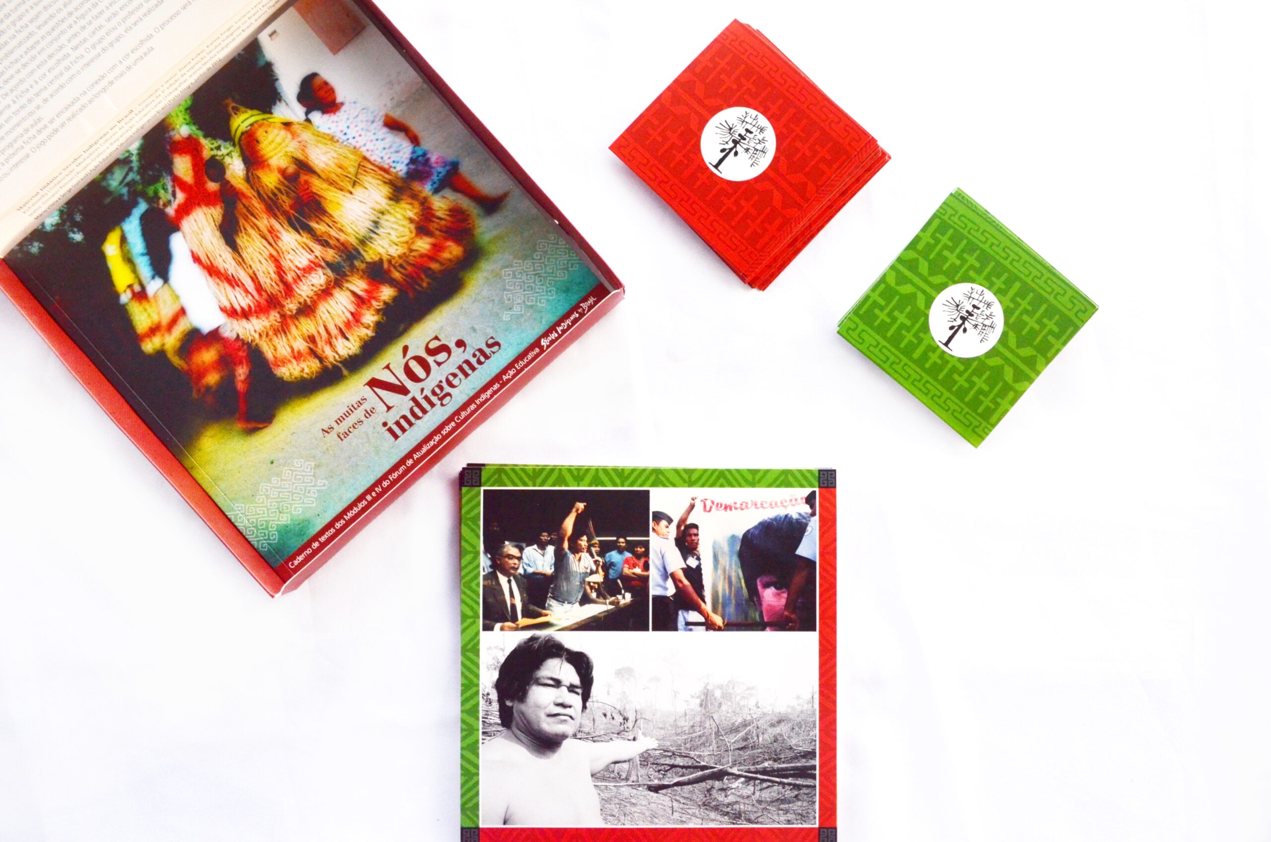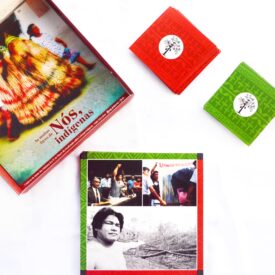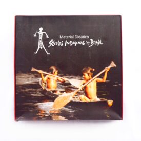 A caixa contém o jogo Cobra-Rio e o livro As muitas faces de nós, indígenas (Caderno de textos dos módulos III e IV do Fórum de Atualização sobre culturas indígenas).